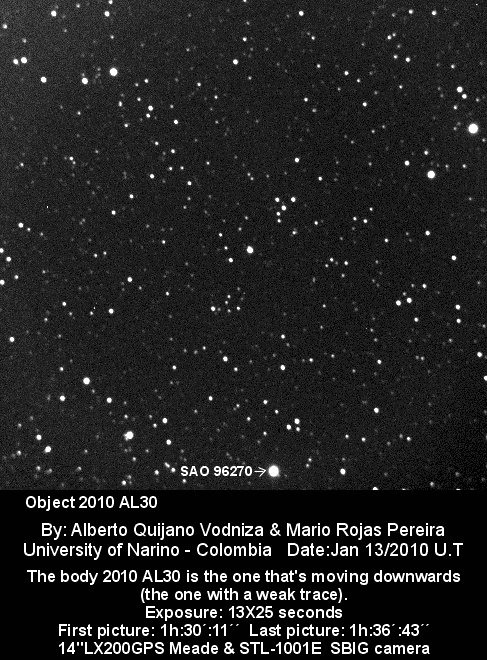 « 2010 AL30 produit à une légère trace lumineuse, en se déplaçant parmi les étoiles », commente Vodniza. "L’animation révèle un second objet beaucoup plus lumineux. C’est un satellite qui se trouvait là, au même moment." L’espace est un endroit très fréquenté.